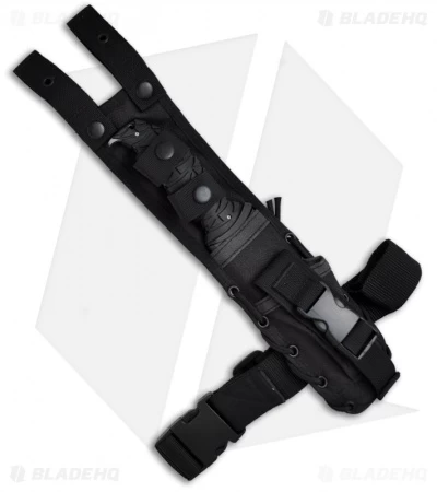 Tactical Sheath. The Ultima’s custom black Cordura®/Zytel® sheath has an injection-molded liner. Dual belt loops are Velcro® adjustable. For maximum versatility, there are ample grommets with a length of 550 paracord included, an adjustable leg strap, plus a slotted sheath back that can mount on MOLLE gear. Removable security handle straps with snaps give access and security. A utility pocket with a Fastex™ buckle will carry a variety of folding knives, multipurpose tools or sharpeners.